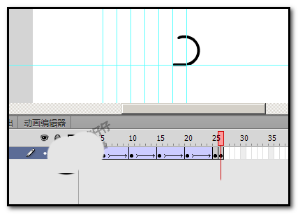 7、在第26幀插入關鍵幀再畫出一個弧形,連在線段上。在第27幀,同樣,插入關鍵幀;再畫出一個弧形;在第28幀,第29幀,分別插入關鍵幀;各再畫出一個弧形