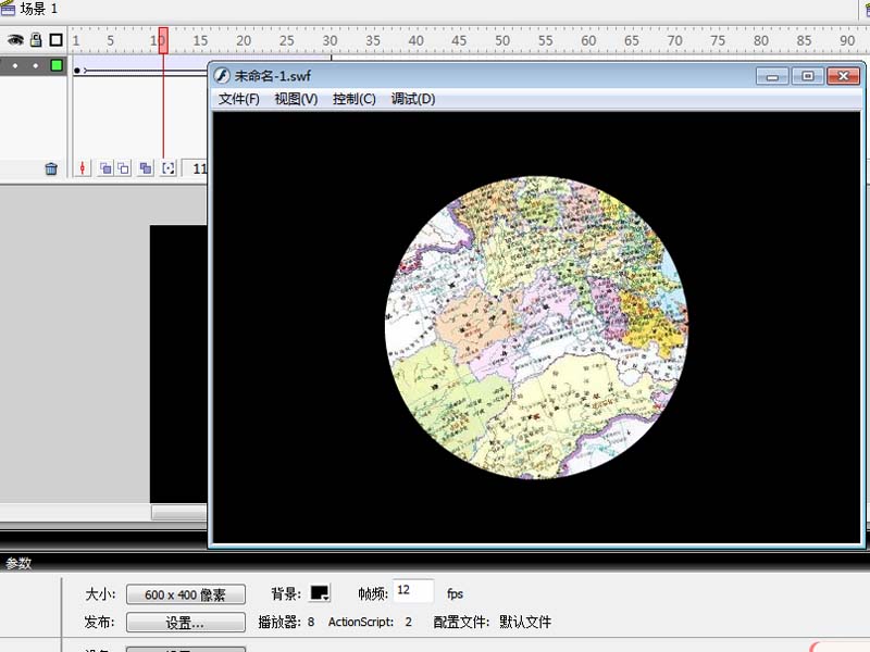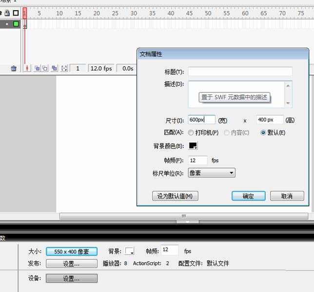 1、首先啟動flash8,新建一文檔,設置大小為600*400,背景顏色為黑色,幀頻為12fps。