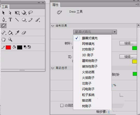 4、大多數工具的屬性面板內都有 xy坐標 、寬度、高度、邊框色、填充色 這六個屬性,然后,對于不同的工具,屬性都有差異。比如說Deco工具,就復雜的多。Deco工具用于繪制 隨機、自然的情景,可以非常迅速的創建一些重復性繪制的效果,
