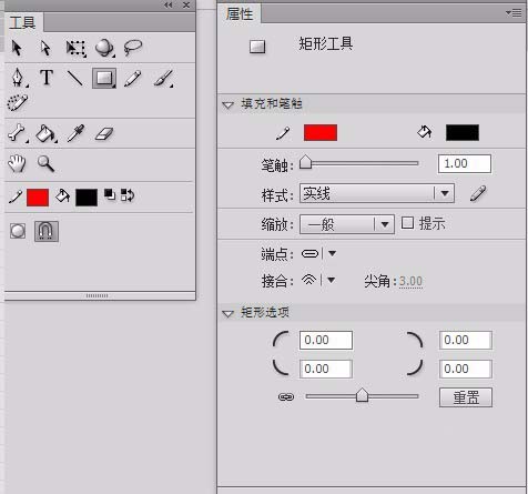 3、如果,我們單擊工具箱內的 矩形工具之后,我們發現 屬性面板變了:如下圖所示。這里有一個 矩形選項,是用于繪制圓角矩形的,我們拖動最下方的滑塊,就可以同時修改四個圓角的數值,然后在舞臺上就可以繪制圓角矩形了。大家可以自行嘗試一下。同理,更換為橢圓工具后,我們發現,與矩形工具的屬性面板如出一轍。