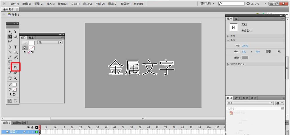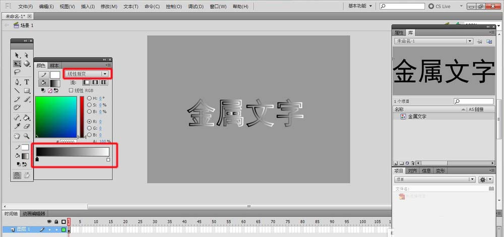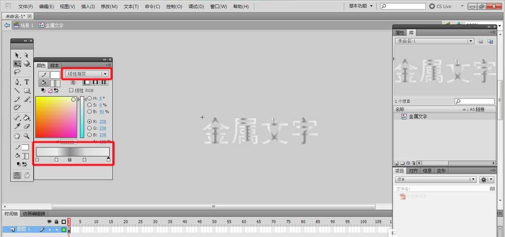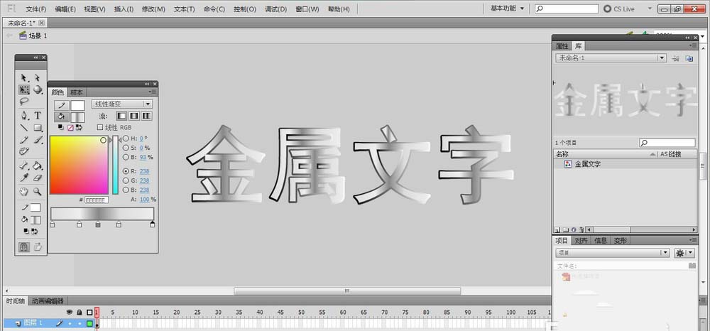 7、將“金屬文字”元件拖入舞臺,與之前輪廓線重合,制作完成。