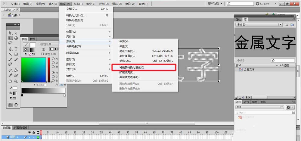 4、刪除舞臺中“金屬文字”元件,選擇所有輪廓線并將其轉換為填充。
