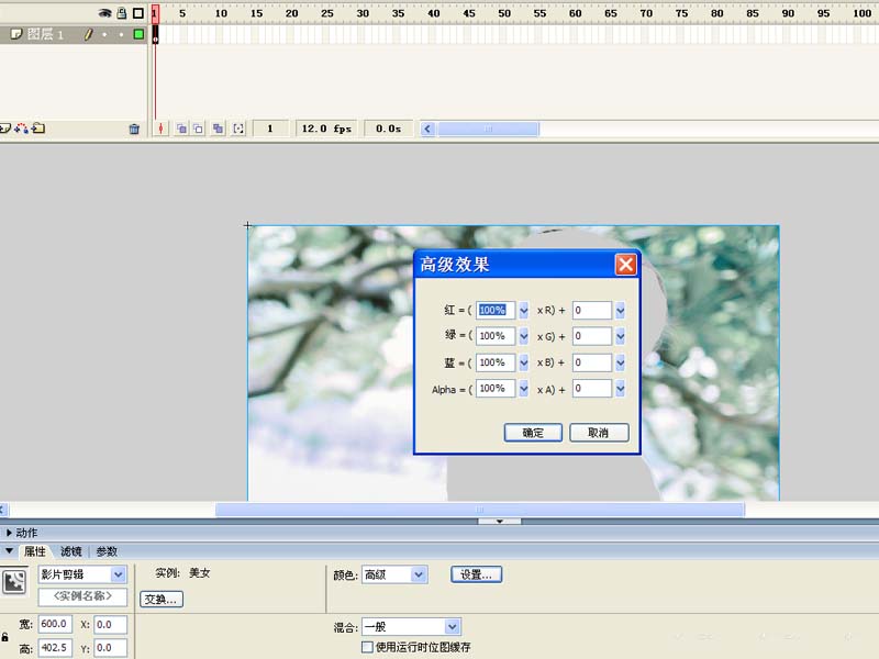 7、選擇圖層1,分別在25幀、110幀處插入關鍵幀,選擇110幀,返回到場景,選擇圖片元件設置顏色屬性為高級,接著彈出高級效果對話框。