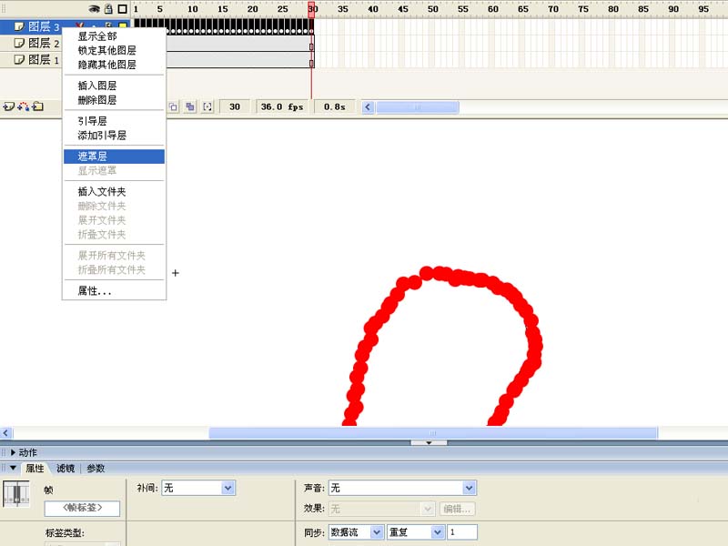 6、在描邊的時候每按一次f6插入關鍵幀描一下,接著右鍵單擊圖層3,從下拉菜單中選擇遮罩層,將圖層3設置為遮罩圖層。