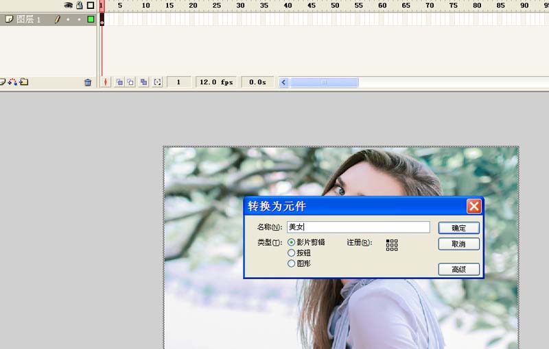 3、右鍵單擊該圖片,從下拉菜單中選擇轉換為元件選項,將其轉換為名稱為“美女”的影片剪輯元件。