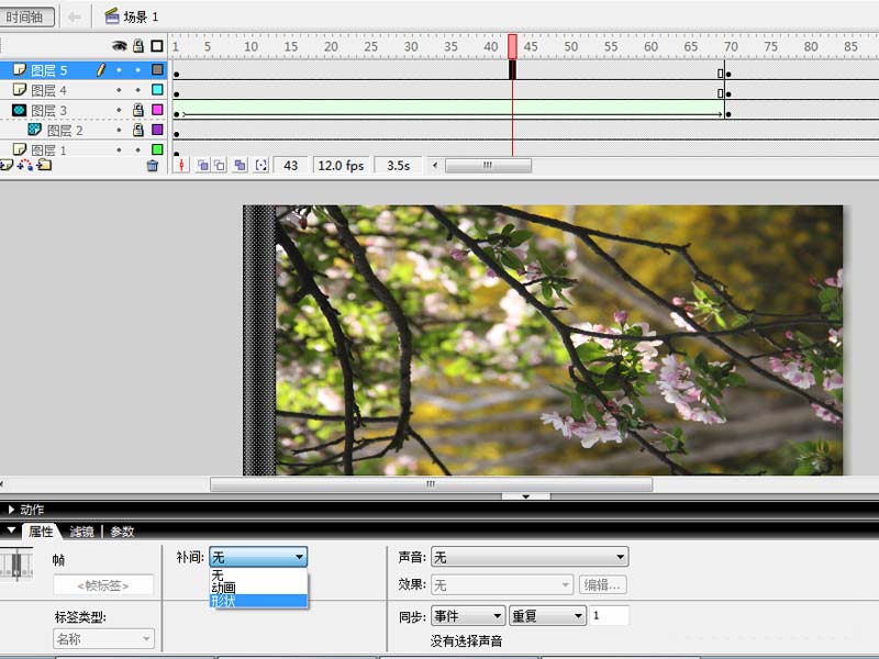 11、在圖層5的70幀處插入關(guān)鍵幀,位置設(shè)置為600,0,并設(shè)置形狀補(bǔ)間,新建圖層6.
