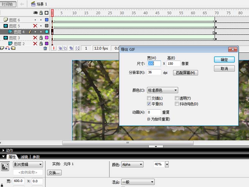 13、圖層4,5解鎖,關(guān)閉圖層2,3,5,選擇圖層4,修改圖層4第一幀和第70幀處的元件的alpha值為40%。