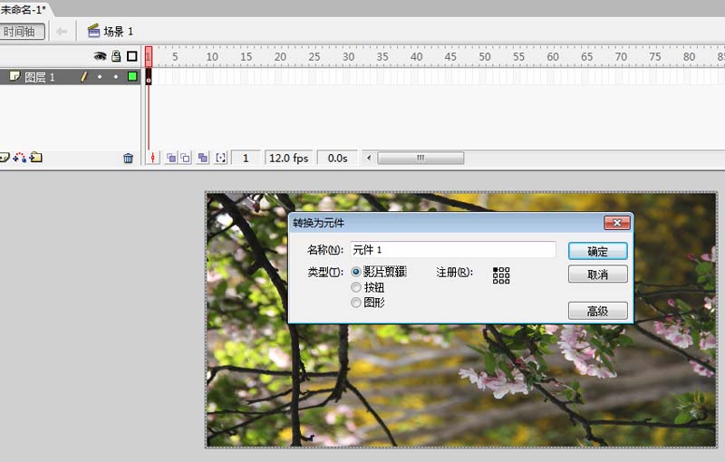 3、從庫中拖拽圖片到舞臺上,設(shè)置大小為600*300,并設(shè)置全居中,按f8鍵將其轉(zhuǎn)換為影片剪輯元件。
