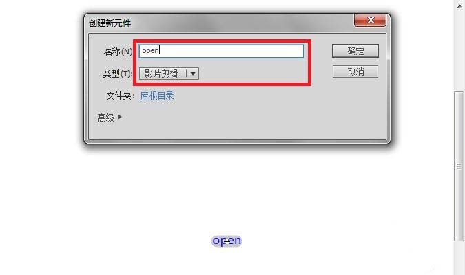 11、新建一個名為“open”的影片元件,將“按鈕”圖形元件拖入,并插入文本“open”。