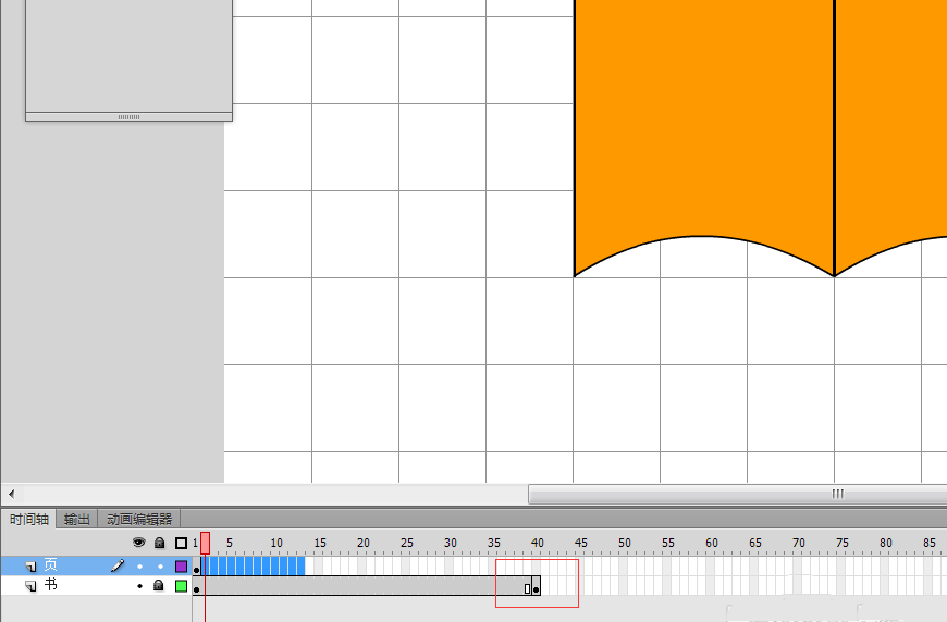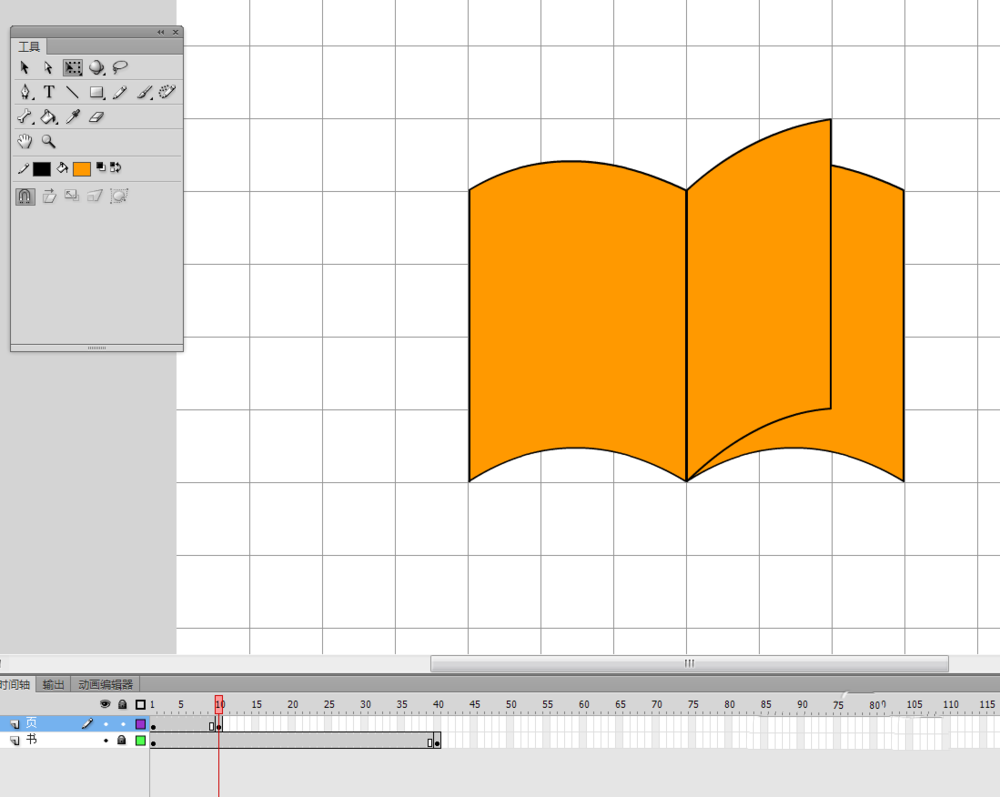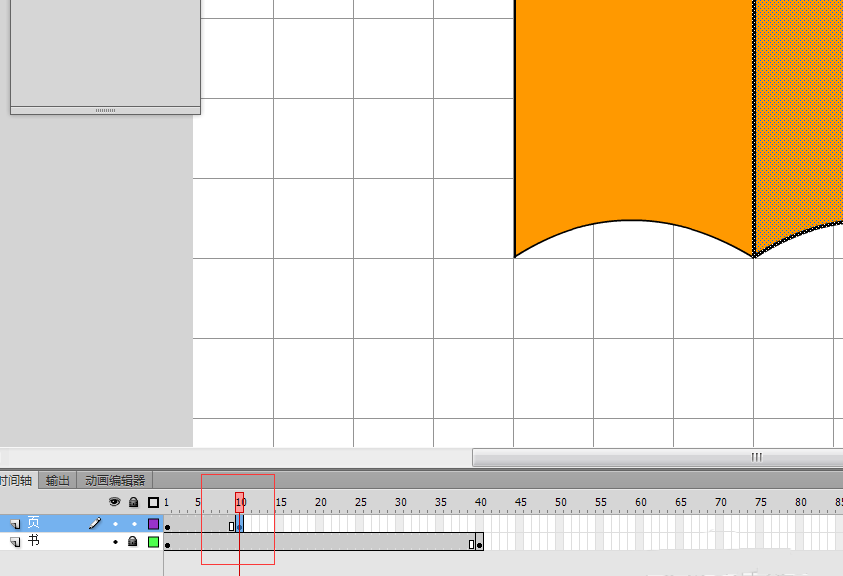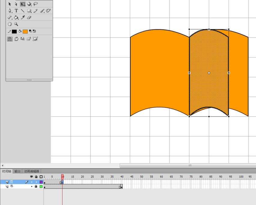8、在圖層“頁”的第10幀右擊,插入關鍵幀,然后選擇任意變形工具把書頁往左側拖小一格,在用選擇工具,將鼠標放與矩形書頁的邊角上出現一個直角的標志,按住鼠標左鍵拖動至合適的位置,如圖
