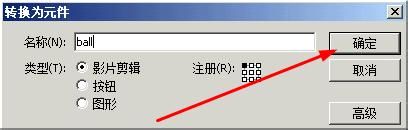 3、將元件名稱設置為ball,類型設置為影片剪輯,然后點擊確定按鈕