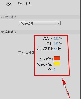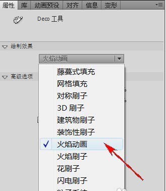 4、在“Deco工具”的屬性面板里“繪制效果”樣式中選擇“火焰動(dòng)畫”