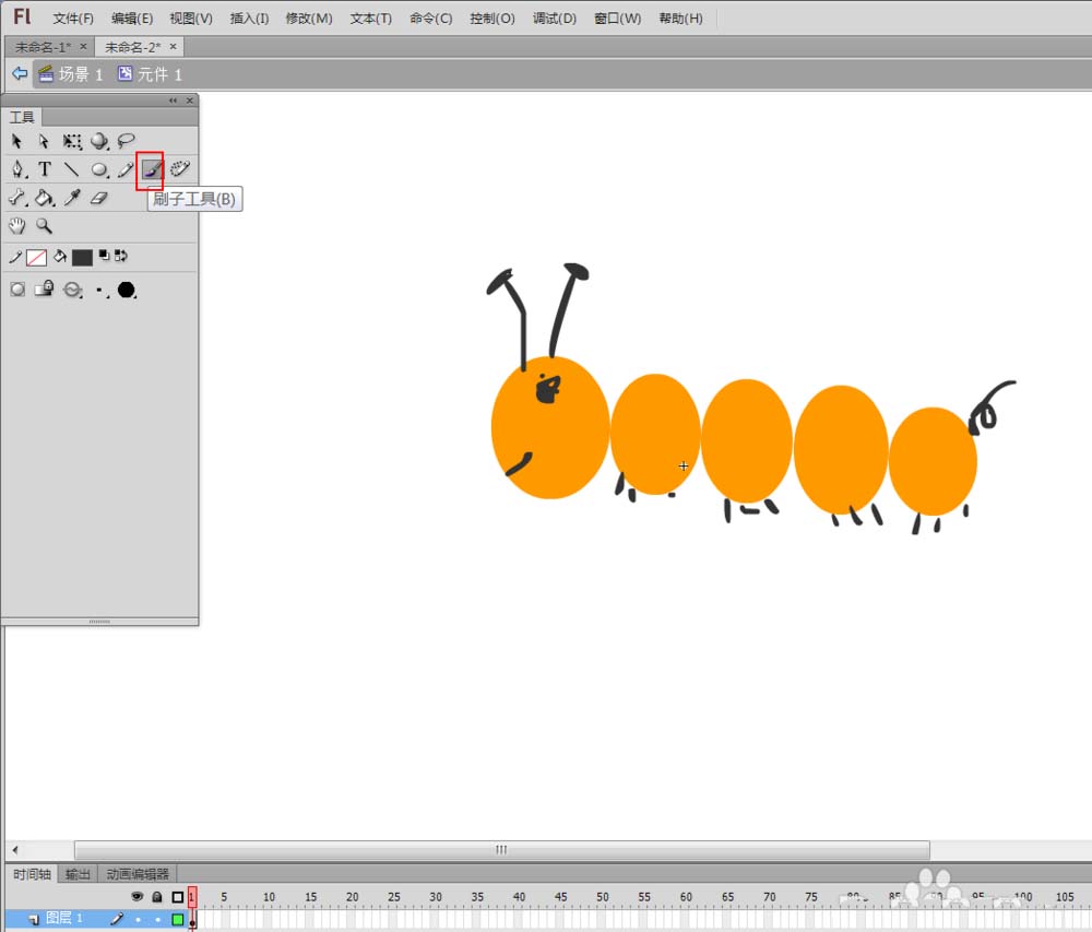 4、然后再選擇刷子工具來畫毛毛蟲的眼睛、嘴巴、腳和尾巴。這不能用鉛筆工具和直線工具。