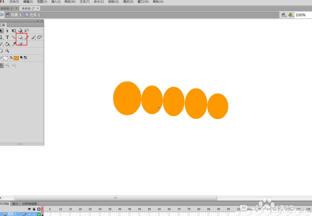 3、在元件編輯區域中選擇橢圓工具,繪制毛毛蟲的身體和頭部。顏色自定