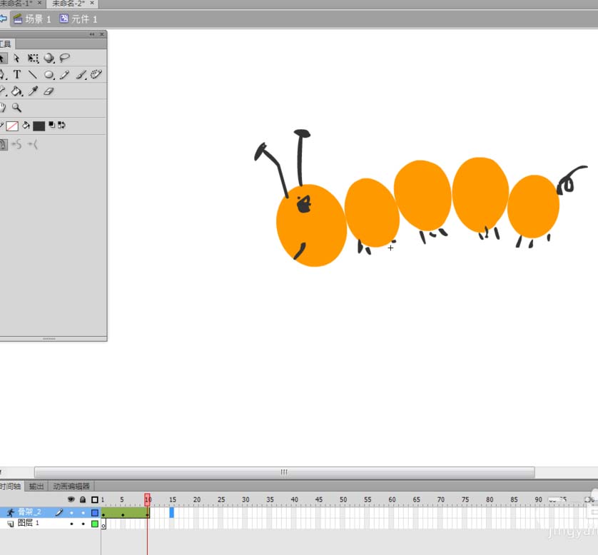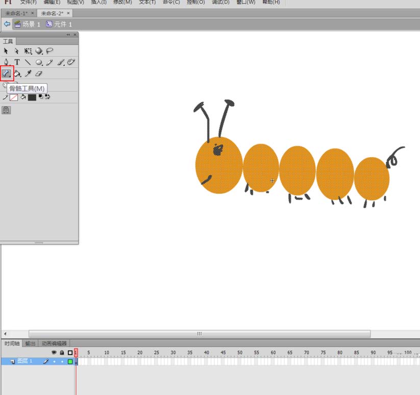 毛毛蟲在運動,用flash做出來,這是很簡單的,這需要用到一個叫做“骨骼工具”的工具了。