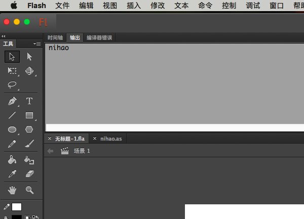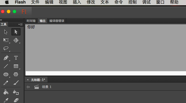 3、然后我們測試一下,快捷鍵CTRL+ENTER,在輸出面板中可以看到這樣的字樣,而在時間軸上也可以看到第一幀里面有個小寫的A,代表里面有代碼