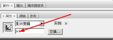 5、選中該影片剪輯,在屬性面板,添加一個(gè)實(shí)例名jx1,這是真正在代碼中使用的名稱,接下來(lái)還要連接類才可以使用