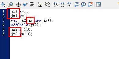 9、添加如下代碼,你看到了實(shí)例名就是jx1,類是jx,這就是使用的方法了,該代碼實(shí)現(xiàn)的效果就是重置矩形的位置,并復(fù)制一個(gè)新的矩形放在舞臺(tái)上。