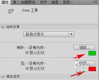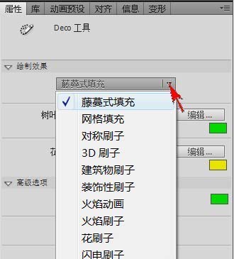 4、在“Deco工具”的屬性面板里“繪制效果”樣式中選擇“藤蔓式填充”