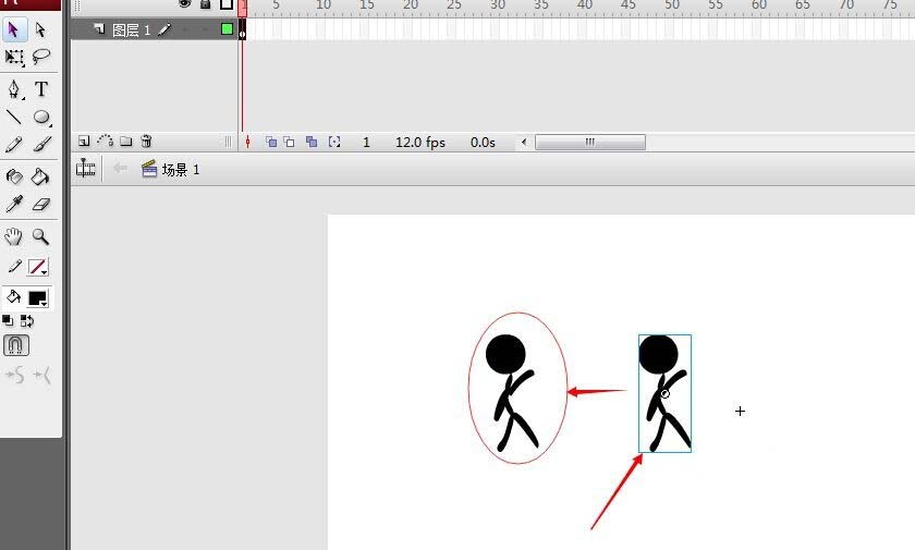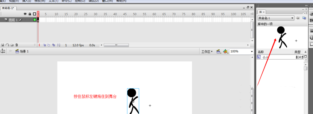 3、回到舞臺,然后把庫中的影片剪輯(你的小人)拖動到舞臺上。