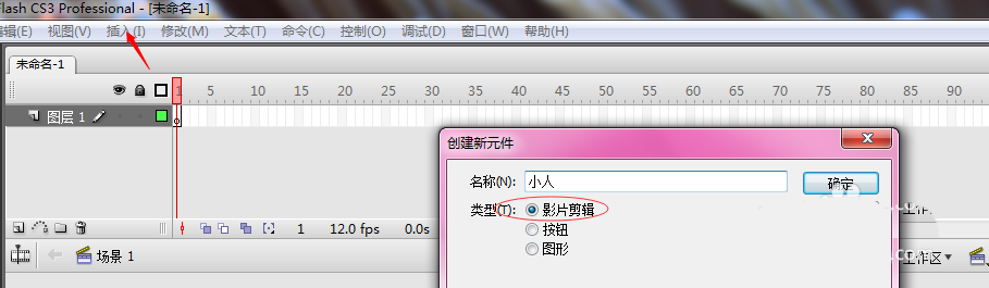 1、點擊flash中的插入,然后新建元件,元件為影片剪輯。