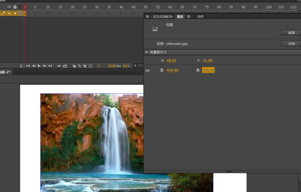 3、然后根據舞臺的大小設置圖片打大小,舞臺的尺寸為550*400,在屬性里面改變尺寸調整坐標