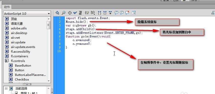 13、輸入鼠標(biāo)隱藏,幀頻事件和光標(biāo)跟隨鼠標(biāo)運(yùn)動(dòng)的代碼。按CRTL+ENTER進(jìn)行測(cè)試,即可達(dá)到效果。