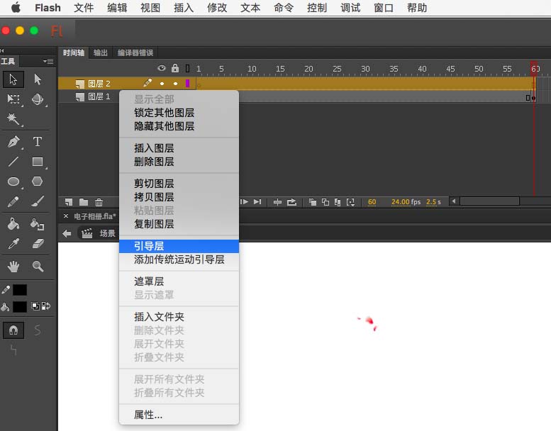 7、在第一層我們將花瓣1拖進(jìn)來,在第60幀處打上關(guān)鍵幀,新建一個圖層右擊轉(zhuǎn)換成引導(dǎo)層