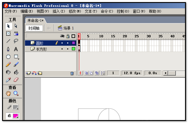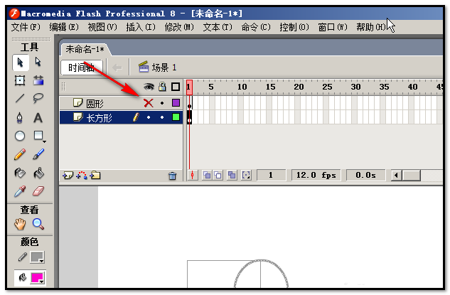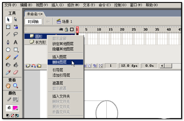 8、或者是,鼠標在“圓形”圖層上右擊,彈出的菜單中點“刪除圖層”。把“圓形”圖層刪除掉,這時,只剩下“長方形”圖層,而舞臺上的圖形保持原來的樣子。操作成功。
