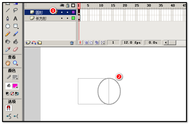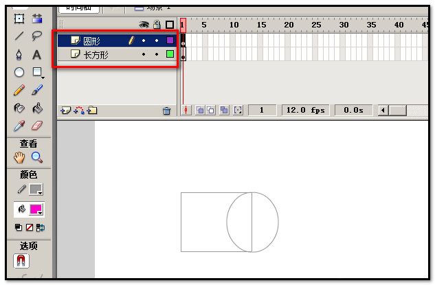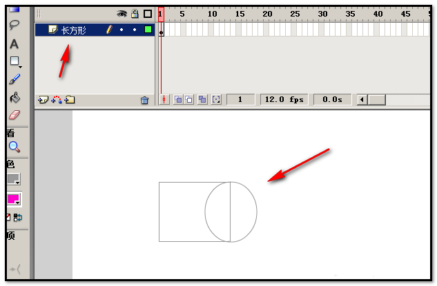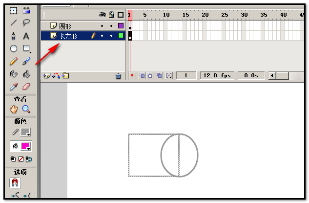 3、現在,需要把這兩個圖形合并在一個圖層上;那么,我們這樣操作把“圓形”圖層圖形合并到“長方形”圖層圖形上。鼠標點下“圓形”圖層,這時,“圓形”圖層上的圖形自動被選中。