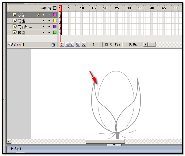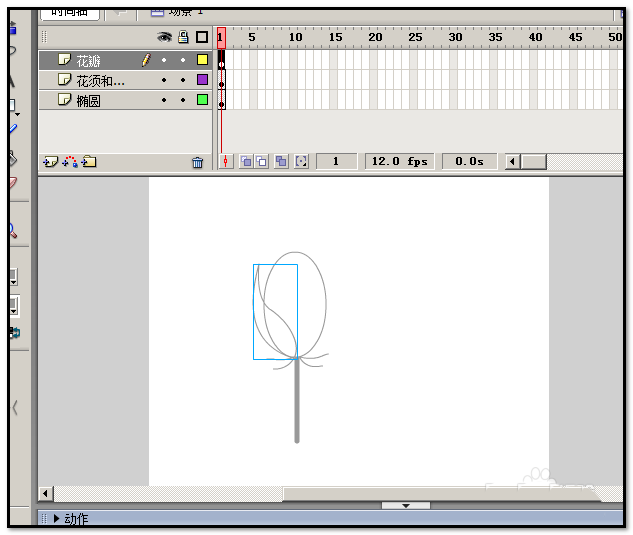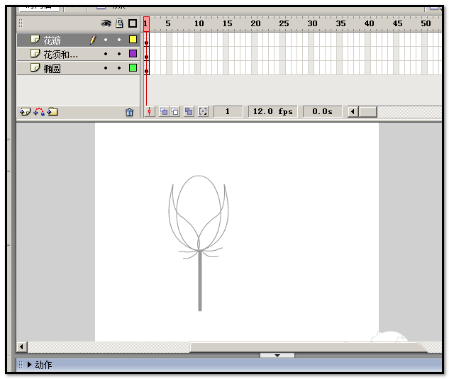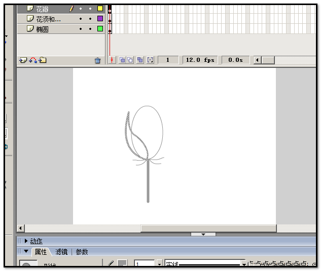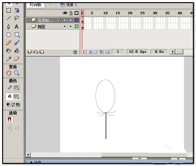 4、然后,把圖層1命名為“橢圓”,并在舞臺上畫出一個橢圓。再新建一個圖層命名為“花須和花梗”,然后,選取線條工具,設置筆觸顏色為灰色,在橢圓底部畫出左兩條須和右兩條花須,再畫一條花梗。