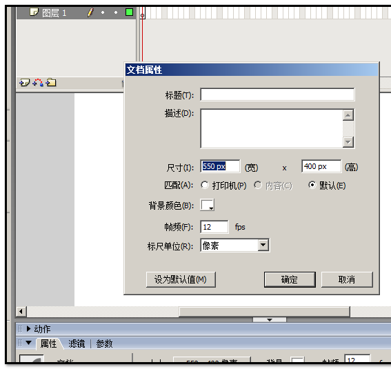 2、如果文檔舞臺尺寸不符合自己的要求,可以鼠標在舞臺上右擊,在彈出的菜單中點“文檔屬性”。在彈出的操作框中,設置舞臺尺寸。