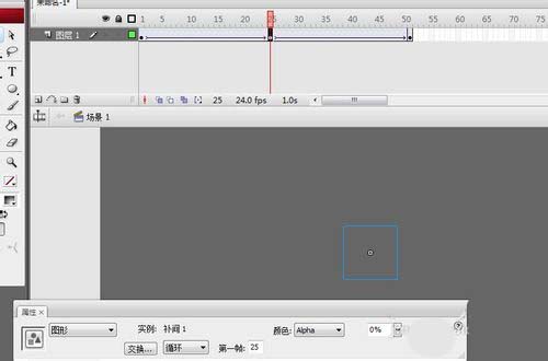 6、在第25幀處,選中小球。在屬性面板中,(屬性面板的快捷鍵為Ctrl+F3)選擇顏色模式為Alpha,把數值調為0%,如下圖所示: