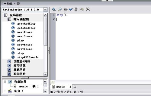 6、下面開始管理音樂?,F(xiàn)在我們要使音樂一開始是停止的,點(diǎn)擊播放按鈕才會(huì)播放。把音樂往后拖一個(gè)幀,然后在第一幀處點(diǎn)擊F9,打開動(dòng)作面板。打開全局函數(shù),打開時(shí)間軸控制。然后點(diǎn)擊stop.