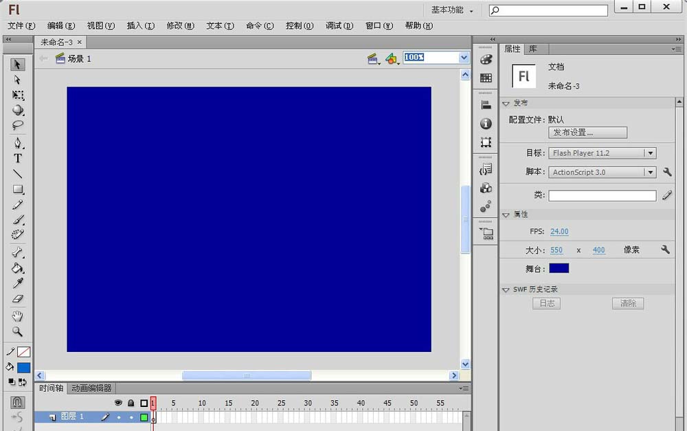 1、首先打開Adobe flash軟件,并且新建一個文檔,將文檔的背景顏色改為深藍色。