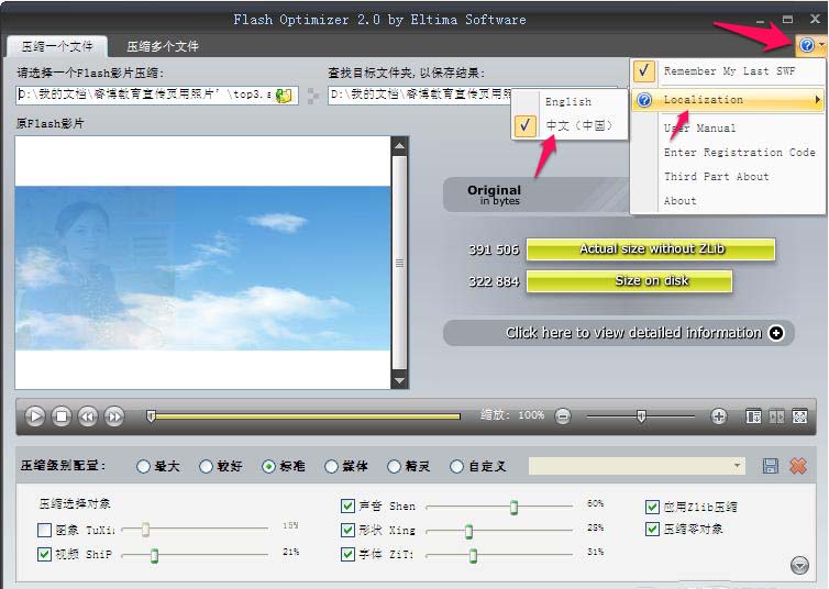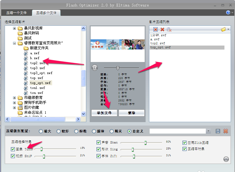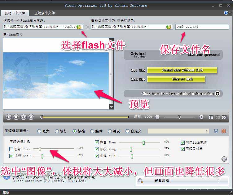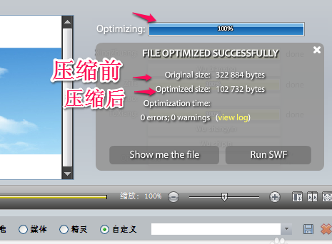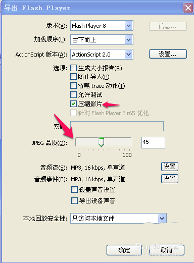 3、選擇flash,設(shè)置壓縮參數(shù),進(jìn)行壓縮。壓縮選擇對(duì)象中的“圖像”如果選中了會(huì)大大降低flash 體積,但圖像質(zhì)量也會(huì)大大降低。