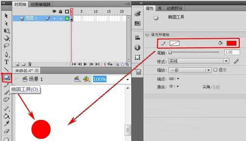 3、在工具欄中選擇“橢圓工具”在舞臺中繪制一個小球,在右邊屬性面板里設置小球的邊框為“無”,顏色為“紅色”。