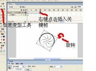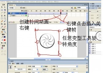 3、回到場景,把剛才在庫里的原件拖進舞臺,用任意變形工具調整大小。然后水平中齊,垂直中齊然后再點涂層億的第一鎮按住不放,往上拖到圖層二的第一幀兩個涂層的第一幀和第二幀同時選中右鍵點擊在轉換為元件。然后右鍵點擊圖層二的第十五幀,插入關鍵幀。點擊任意變型工具,旋轉該圖片到一個角度,然后再在涂層二的第30幀;第45幀處。右鍵點擊插入關鍵幀同時旋轉角度,然后分別在第十幀;第二十幀;第四十幀右鍵點擊。創建補間動畫。就此完成測試影片,并保存為gif格式