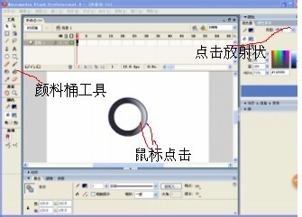1、打開軟件,,打開flash文檔然后點擊圖層一第一幀。再點擊顏料版把填充色改成沒有,然后按住shift在編輯區內畫一個正圓,然后點擊對齊面板中的水平中齊和垂直中齊,然后再在空白的地方在畫一個,比剛才那個圓稍大一些的正圓。然后水平中齊,垂直中齊。然后添加顏色打開顏色面板,在“混色器”里面找到“類型”然后點擊后面的“下拉小三角”點擊放射狀。調整顏色。