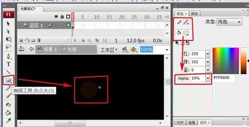 6、用“橢圓工具”在頁面畫一個圓,設邊框為“無”,填充色為“桔紅色”,并設Alpha值為“10%”。