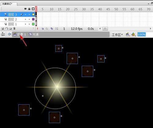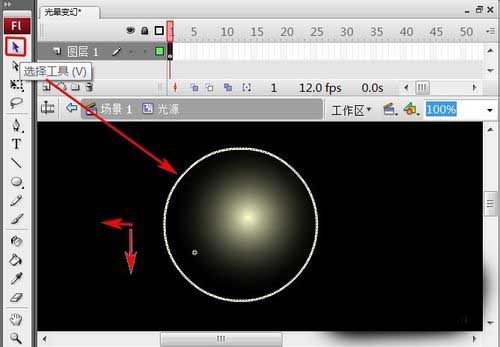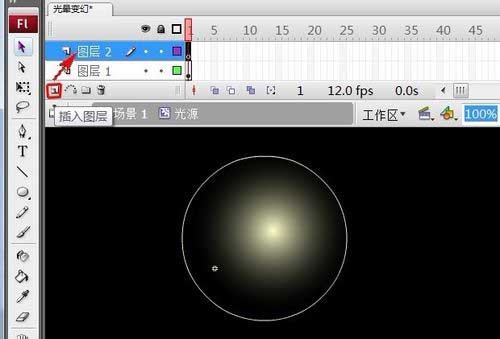 16、選中“圖層1”第1幀,把“光源”元件拖上頁面上。