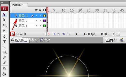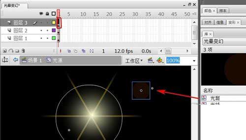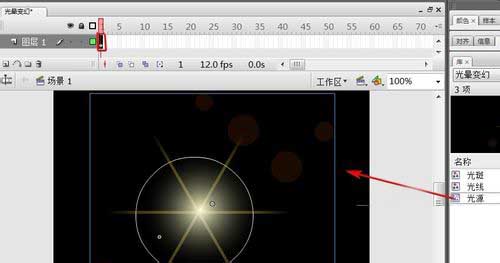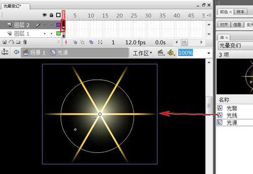 11、選中“圖層2”第1幀,把“光線”元件拖上頁面上。