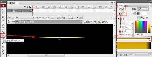 3、選中“圖層1”第1幀,用“矩形工具”繪制一個又長又細的矩形,設矩形的邊框為“無”,填充色為“黑—黃—白—黃—黑”線性漸變。