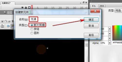 7、“Ctrl+F8”新建一元件,名稱為“光源”,類型為“影片剪輯”。