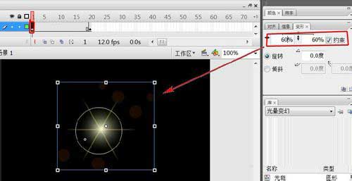 18、選中“圖層1”第1幀,在“變形”面板里選擇“約束”,在水平縮放或垂直縮放里輸入縮放值為60%,然后按鍵盤中的“Enter鍵”確認。