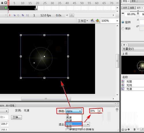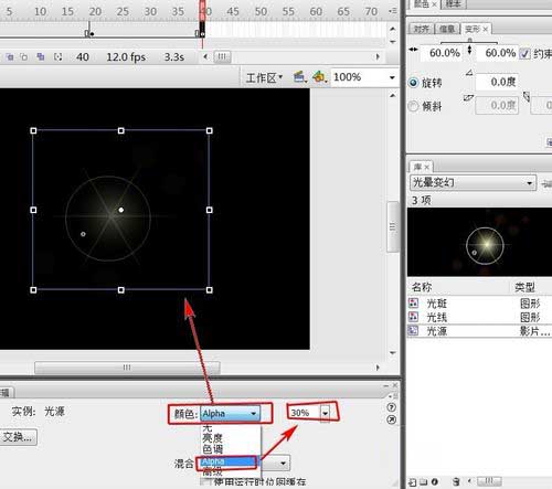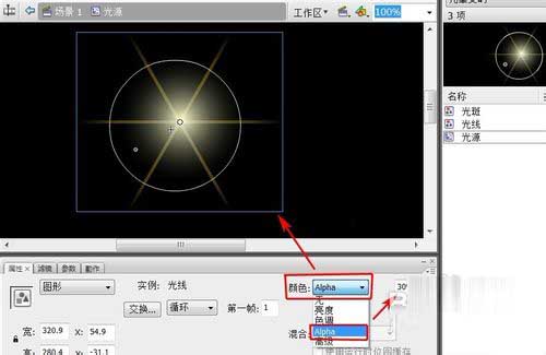12、選中剛拖進來的“光線”,在“屬性”面板里設“顏色”—“Alpha”的值為30%。