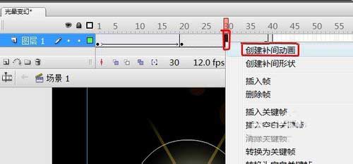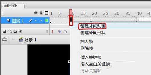 24、在“圖層1”中第20幀至第40幀之間選擇任意一幀,右鍵選擇“創建補間動畫”。