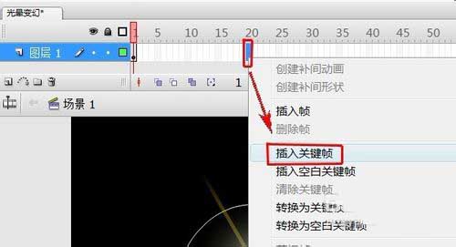 17、選中“圖層1”第20幀,右鍵選擇“插入關鍵幀”。