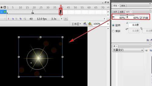 21、選中“圖層1”第40幀,在“變形”面板里選擇“約束”,在水平縮放或垂直縮放里輸入縮放值為60%,然后按鍵盤中的“Enter鍵”確認。