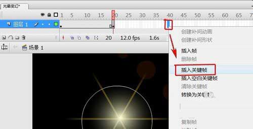 20、選中“圖層1”第40幀,右鍵選擇“插入關鍵幀”。